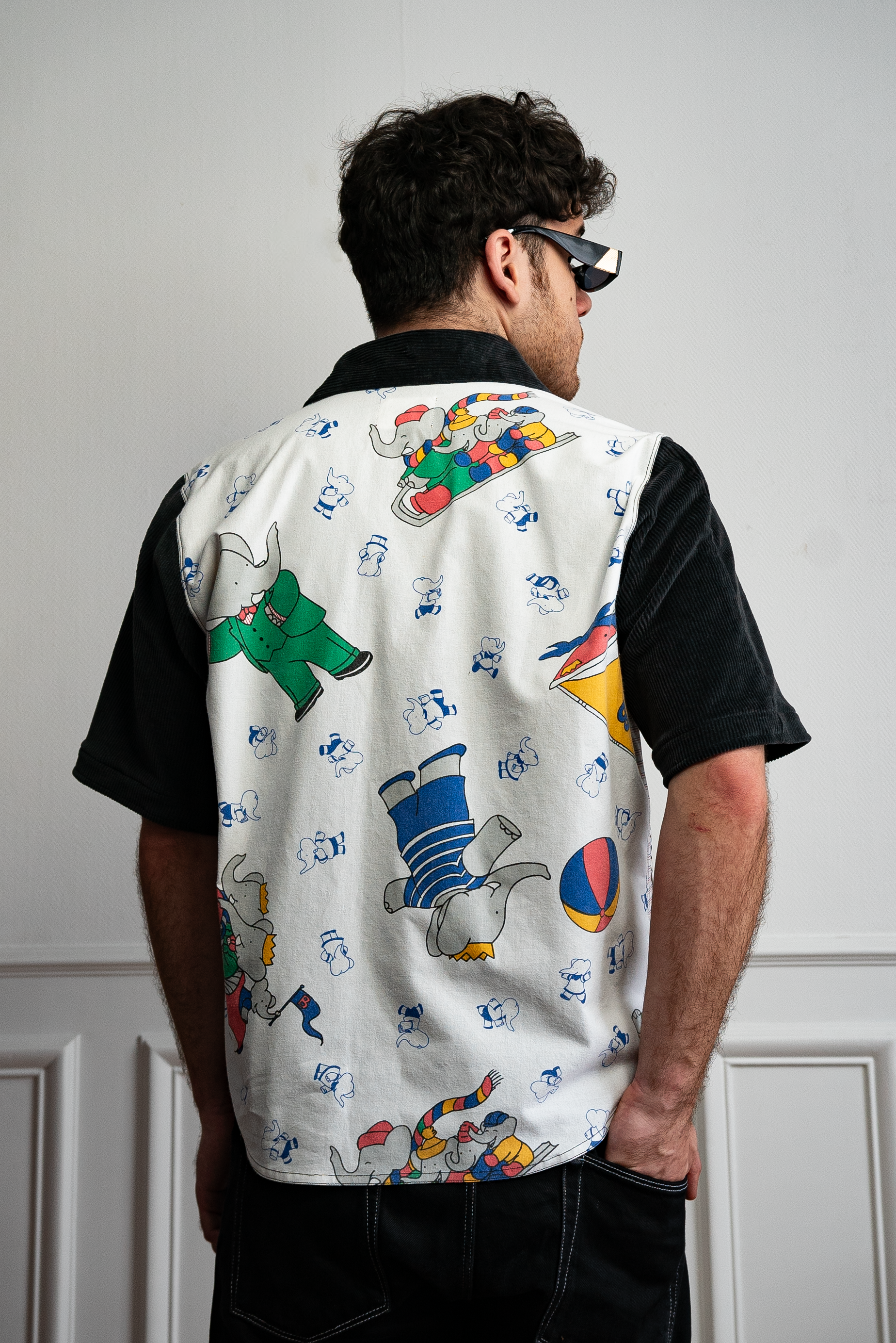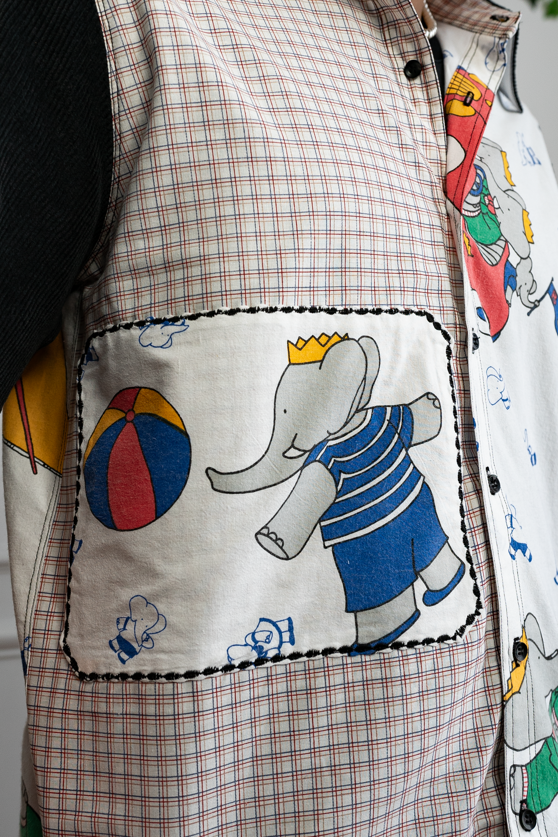 Chemisette confectionnée à partir de draps vintages et d'autres matériaux de récupération soigneusement sélectionnés. Chaque chemisette est une pièce unique, créée avec passion et un savoir-faire artisanal.